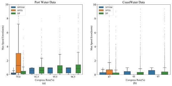 Comparison of the max speed error between the proposed method (DPTSM), the DPTS method, and the DP method with the same compression rate. (a) Comparison of the max speed error in port waters. (b) Comparison of the max speed error in coast waters.