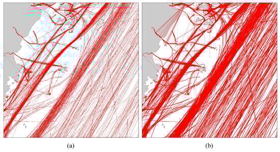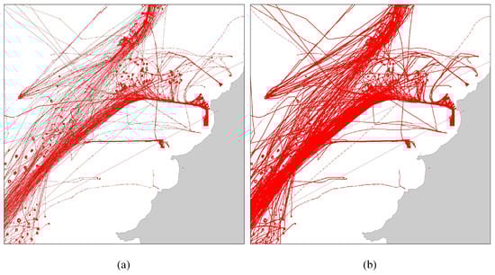 Visual analysis of the coastal water datasets. (a) is AIS trajectory after compression (b) is AIS trajectory before compression.