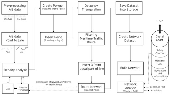 The AIS data comprising spatial information are essentially a maritime traffic dataset including various attribute information [25]. Spatial information can be used as a basis for various analyses such as maritime traffic pattern recognition, maritime traffic prediction, and maritime traffic networks using geographic information systems (GIS) [26]. In this study, ArcGIS Pro 3.0.3 was used to generate maritime traffic routes, perform delay triangulation, build network datasets, and perform network analysis. To differentiate it from previous studies, AIS data were used as the basis for maritime traffic density analysis. Furthermore, a network dataset was developed based on ArcGIS to store the routes of various ships in the marine space, and a network analyst was used [27]. Additionally, the digital chart’s shapefile files were combined with network analysis for practical ship use. Considering safety, adherence to navigation regulations, and accident prevention, we propose a shortest path maritime traffic network.
