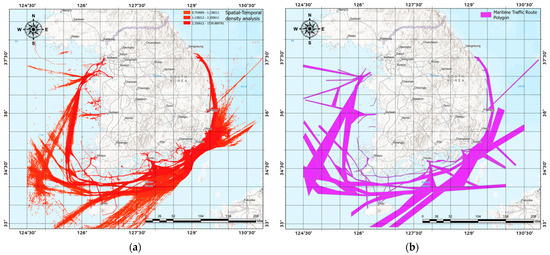 Visualization of AIS data analysis: (a) results of spatial-temporal density analysis targeting AIS; and (b) polygon results of maritime traffic area including spatial-temporal density analysis results.