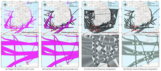 Results of the density-based Delaunay triangulation performed on the coastal waters of Korea: (a) spatial-temporal density-based polygon representing the maritime traffic flow, (b) insertion of points at regular intervals along the edges of the polygon, (c) initial results of Delaunay triangulation before filtering, and (d) results after filtering.