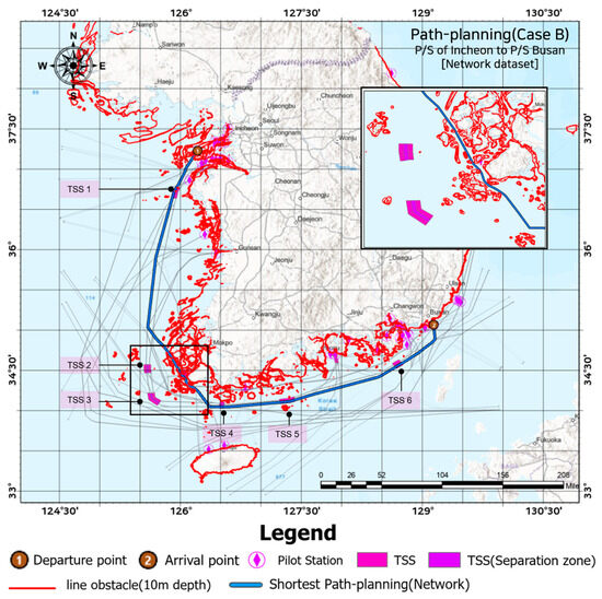 Path planning of the network dataset (Case B) from Incheon to Busan.