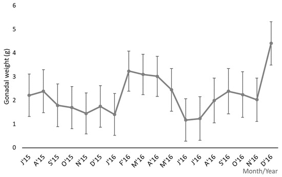 - Garmendia, J.M.; Menchaca, I.; Belzunce, M.J.; Franco, J.; Revilla, M. Seasonal variability in gonad development in the sea urchin (Paracentrotus lividus) on the Basque coast (Southeastern Bay of Biscay). Mar. Pollut. Bull. 2010, 61, 259–266. [Google Scholar] [CrossRef] [PubMed]