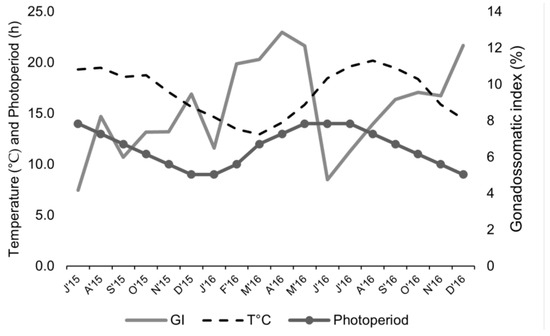 3.2. Variation in Gonadosomatic Index, Temperature and Photoperiod