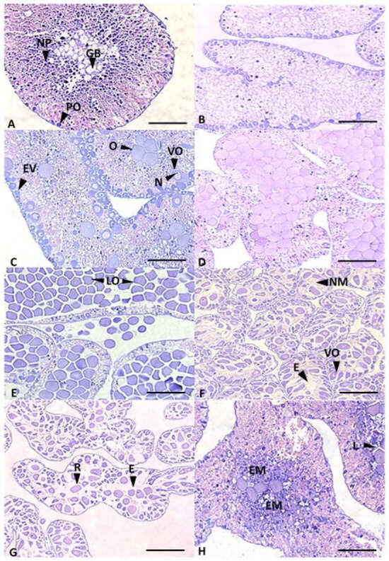 - Barbaglio, A.; Sugni, M.; Di Benedetto, C.; Bonasoro, F.; Schnell, S.; Lavado, R.; Porte, C.; Candia Carnevali, D.M. Gametogenesis correlated with steroid levels during the gonadal cycle of the sea urchin Paracentrotus lividus (Echinodermata: Echinoidea). Comp. Biochem. Physiol. 2007, 147 Pt A, 466–474. [Google Scholar] [CrossRef]
