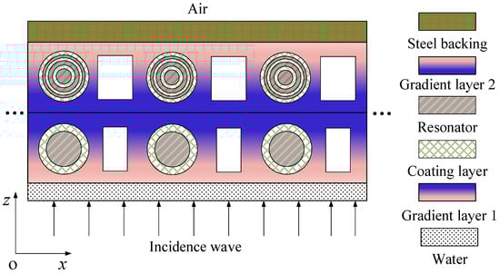 Considering the cavity resonance acoustic structure (CRAS), multi-resonator coupling resonance acoustic structure (MCRAS), and FGMs, the MMSC−AS was devised by combining with the sound characteristics of the three acoustic structures. A diagram of the underwater sound-absorption physical model of the MMSC−AS is shown in Figure 1. It can be observed that the matrix was composed of gradient layers 1 and 2, wherein gradient layer 1 contained multi-layered spherical resonators and cylindrical cavities and gradient layer 2 contained the single spherical resonators and cylindrical cavities. In addition, the multi-layered resonators were connected with each other through the coating layers, and the resonators and cavities were alternately and periodically arranged along the x direction, and the resonators (or cavities) arranged periodically along the y direction. The MMSC−AS was applied on the surface of the steel plate, and the other side of the steel plate, there was a semi-infinite water domain. The sound wave incidents were vertically along the thickness of the MMSC−AS.