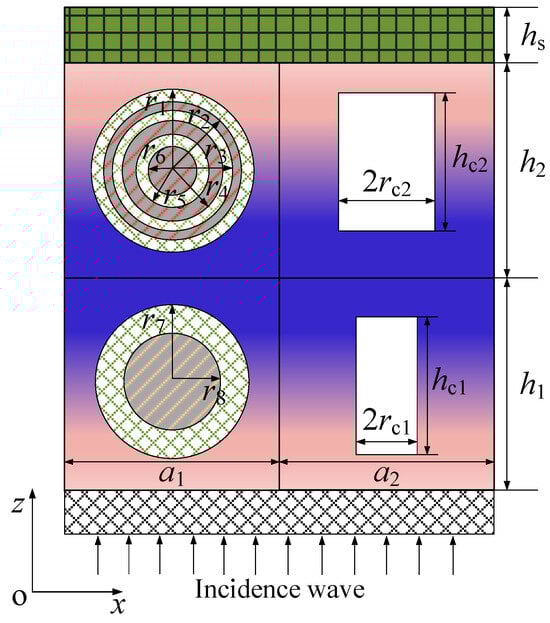 A diagram of a unit cell of the MMSC−AS on the xoz plane is shown in Figure 2. The thickness of gradient layer 1 is h1, and the radii of the multi-layered coating layers and spherical resonators are ri (i = 1–6). The height and radius of the cylindrical cavity are hc1 and rc1, respectively. The thickness of gradient layer 2 is h2, and the radii of the single spherical resonator and coating layer are r7 and r8, respectively. The height and radius of the cylindrical cavity are rc2 and hc2, respectively. Additionally, the thickness of the steel plate is hs, and the distance between adjacent cavities in each layer is a1 + a2. The FGMs proposed in this paper were synthesized from epoxy and inorganic fillers. The gradient indices of gradient layers 1 and 2 are P1 and P2, respectively. The materials of the coating layer and resonators are soft rubber and steel, respectively.