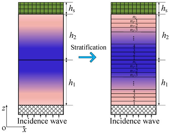 The schematic diagram of stratification for FGMs is shown in Figure 3, and the thicknesses of gradient layers 1, 2, and the steel plate are h1 = 30 mm, h2 = 30 mm, and hs = 10 mm, respectively. Then, gradient layers 1 and 2 are evenly stratified into n1 and n2 thin layers, respectively. The distribution of the material properties of the matrix of the MMSC−AS along the thickness direction is shown in Figure 4. The material properties of each component of the MMSC−AS are listed in Table 1, which were the same as those in Ref. [49]. The sound speed and density of water were c = 1489 m/s and ρ0 = 1000 kg/m3.