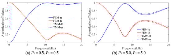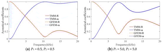 As displayed in Figure 3, gradient layers 1 and 2 can be evenly divided into n1 = n2 = 1000 thin layers. The acoustic coefficients obtained through the transfer matrix method (TMM), FEM, and G-FEM are displayed in Figure 5 and Figure 6. It can be found that the acoustical coefficient curves obtained through the FEM and G-FEM were consistent with those obtained through the TMM. It proves that the G-FEM computation program is correct (The program runs in software Python2.7). However, the deviations between the TMM and FEM were obvious in the high frequency when P1 = 5.0 and P2 = 5.0, while the acoustic coefficients obtained through the G-FEM were consistent with TMM in the high frequency. Therefore, the accuracy of the G-FEM was better than that of the FEM when the number of mesh elements was the same.