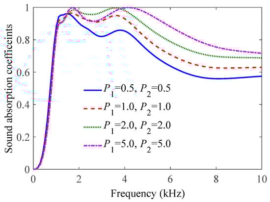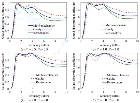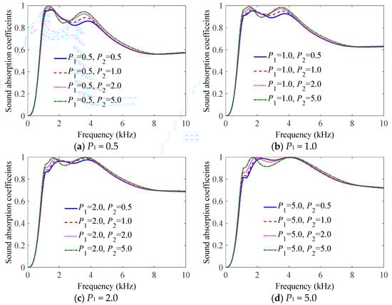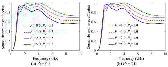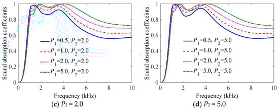 The effects of P1 and P2 on the SAC of MMSC−AS were studied. The effect of P1 on the SAC of the MMSC−AS is displayed in Figure 11. The sound absorption characteristics of the MMSC−AS at low frequencies were not affected by the change in P1, the frequency of the first SAP was almost unchanged, and the second and the third SAPs moved to high frequencies.