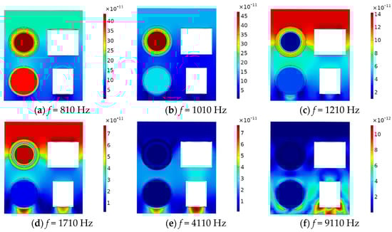 When P1 = 5.0 and P2 = 5.0, the vibration mode of MMSC−AS at various frequencies is shown in Figure 8. It can be seen that, when f = 1010 Hz, corresponding to the first sound absorption peak (SAP), the vibration energy is mainly concentrated in the resonators in the low-frequency range, and the modulation of MMSC−AS on sound waves is mainly through the local resonance of resonators. As the frequency increases, when f = 1210 Hz and f = 1710 Hz (the second SAP), the vibration energy is mainly concentrated on gradient layers 1 and 2, the steel plate, and resonators, respectively, and the sound waves are modulated by the bending vibration of gradient layer and steel plate, coupling resonance between the multi-resonator and cavity resonance. In contrast, in the high-frequency range, when f = 4110 Hz (the third SAP) and f = 9110 Hz, the structural vibration energy was mainly concentrated in gradient layer 1, and the effect of MMSC−AS on sound waves was mainly through the bending vibration of gradient layer 1, which converted longitudinal waves into transverse waves. Therefore, the synergistic effect between the mechanisms enriched the sound wave modulation modes because of the multiple sound wave modulation mechanisms inside the MMSC−AS, and the sound absorption band could be broadened with effect.