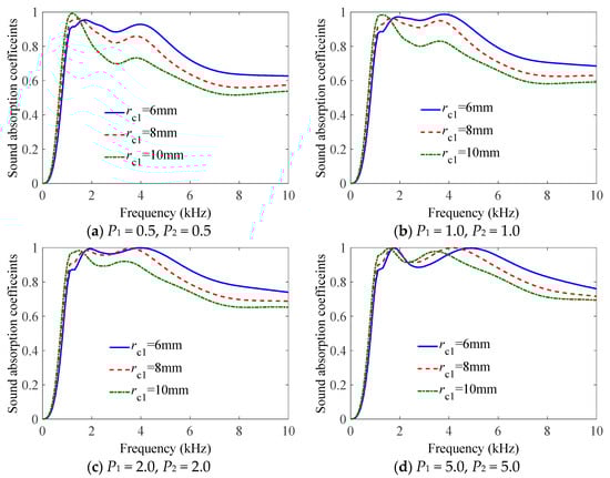 The change in the SAC of MMSC−AS with the cavity radius rc1 is shown in Figure 13. It can be found that, as the cavity radius rc1 of gradient layer 1 increased, the sound absorption performance of the MMSC−AS at low frequencies was almost unaffected, and the frequency of the first SAP was almost unchanged. However, the second and the third SAPs both shifted to lower frequencies, which increased the value of the first SAP, and the absorption coefficients of the MMSC−AS decreased at high frequencies.