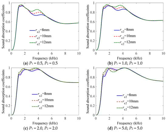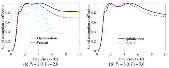 According to the sound absorption characteristics analysis in Section 3.2, the cavity radii rc1 and rc2 of gradient layers 1 and 2 were important considerations affecting the sound absorption characteristics of the MMSC−AS. Taking the geometric parameters of the cavity of the MMSC−AS as variables, the range of geometric parameters for the cavities of gradient layers 1 and 2 and the selection of initial values are shown in Table 2. Taking P1 = 2.0, P2 = 2.0 and P1 = 5.0, P2 = 5.0 as examples, the optimization of the sound absorption characteristics is carried out in software COMSOL5.6, and the optimal solution of the geometric parameters and the SAC after optimization can be achieved.