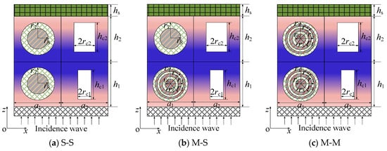 The effect of the resonator distribution of gradient layers 1 and 2 on the SAC of the MMSC−AS was investigated, and the schematic diagram of MMSC−AS with different resonator distribution forms is shown in Figure 15. It can be seen that both gradient layers 1 and 2 contained a single resonator, as shown in Figure 15a, named S-S. As shown in Figure 15b, gradient layer 1 contained a multi-resonator, while gradient layer 2 contained a single resonator, named M-S. As for Figure 15c, both gradient layers 1 and 2 contained multi-resonators, named M-M, and it was named S-M for the MMSC−AS displayed in Figure 2. The filling rate and geometric parameters of the resonators of the four units were the same, respectively.