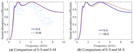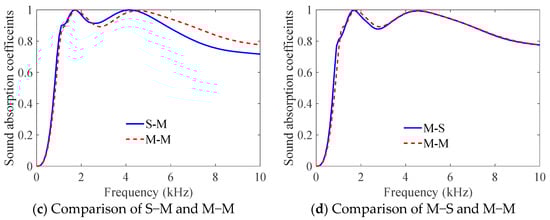 When P1 = 5.0 and P2 = 5.0, the SAC of the MMSC−AS with different resonator distributions are displayed in Figure 16. It can be found that, when the multi-resonator was embedded in gradient layer 1, the frequencies corresponding to the first and second SAPs of the MMSC−AS were basically unchanged compared with S-S, and the absorption coefficient of the MMSC−AS increased at high frequencies. In Figure 16b, when the multi-resonator was embedded in gradient layer 2, the first and second SAPs of MMSC−AS moved to higher frequencies, while the frequency corresponding to the third SAP basically remained unchanged compared with S-S, and the absorption coefficient of the MMSC−AS at high frequencies basically remained unchanged. By comparing S-M with M-M, it can be observed from Figure 16c that, when the distribution of resonators inside gradient layer 1 was changed, the acoustic absorption behavior of the MMSC−AS at low frequencies was basically not affected. Additionally, the third SAP moved to higher frequencies, and the SAC of the MMSC−AS at high frequencies increased. In contrast, by comparing M-S with M-M, it can be found from Figure 16d that, when the distribution of resonators inside gradient layer 2 changed, the first and second SAPs of the MMSC−AS moved to higher frequencies.