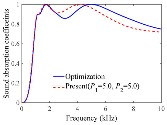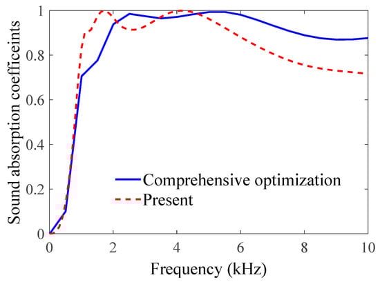 When the geometric and material parameters of MMSC−AS were optimized simultaneously, the optimized material parameters and geometric parameters were Young’s modulus E = 5.4 × 108 Pa, density ρ = 3100 kg/m3, Poisson ratio ν = 0.45, gradient index P1 = 5.0, P2 = 2.0, rc11 = 3.0 mm, rc12 = 3.0 mm, hc1 = 10 mm, rc21 = 3.0 mm, rc22 = 3.0 mm, and hc2 = 10 mm, respectively. The sound absorption curves before and after the comprehensive optimization of the MMSC−AS are shown in Figure 19, the frequency corresponding to the first SAP was almost immutable, the second and third sound SAPs shifted to higher frequencies after the comprehensive optimization of the SAC of MMSC−AS, and the SAC increased notably at high frequencies.