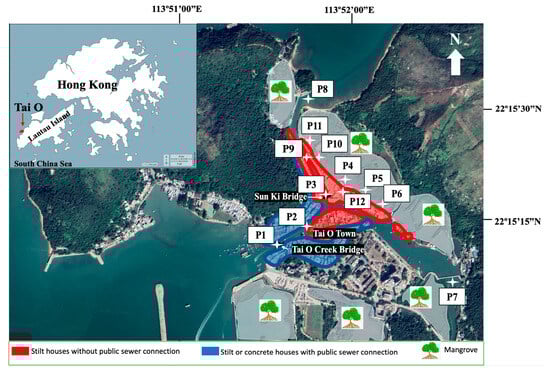 Tai O village is located on the western coast of Lantau Island, Hong Kong, China, adjacent to the South China Sea and at the mouth of a mountain stream that flows into the sea and forms a small estuary (Figure 1). Stilt houses are built along the banks of three major water channels and their density varies across different parts of the village. Most of the untreated sewage from stilt houses is directly discharged into the surrounding waterbodies and subsequently dispersed into mangrove wetlands through tidal activity. To investigate the impact of municipal sewage on coastal water quality and mangrove wetland ecosystems, the number of stilt houses was counted and estimated prior to sampling, and 12 sampling points were selected based on the density of stilt houses there and the nearby water flow. Sampling point P1 (22.253991, 113.862119) was located near the mouth of the water channel, surrounded by concrete houses that are connected to the centralized municipal sewage system. Sampling points P2 (22.254514, 113.863058), P3 (22.255612, 113.863916), and P9 (22.256950, 113.862923) were in areas with a relatively low density of stilt houses and were located along the bank of the main water channel. P4 (22.255940, 113.864956), P5 (22.255806, 113.865108), P6 (22.255354, 113.865932), P10 (22.256999, 113.863225), and P11 (22.257700, 113.862872) were located in the area with the highest density of stilt houses, whose untreated domestic sewage was regularly discharged into a semi-enclosed mangrove wetland with limited tidal flushing, as shown in Figure 1. Among these sampling points, the stilt houses in P10 and P11 had a higher vacancy rate than in the other points, while P4 was located near a sluice gate that controls the influx of tidal water. P12 (22.255853, 113.864851) was also in an area with a high stilt house density, but its sewage was discharged into a tidal channel that is flushed twice a day. Although both P7 (22.253205, 113.869193) and P8 (22.258909, 113.862700) were in areas with no or few buildings nearby, P8 was located in the mouth of a water channel facing the South China Sea, while P7 was at the entrance of the stream close to some concrete houses without public sewer connection. Some stilt and concrete houses in P1, P2, and P3 were connected to a public sewer system, and their sewage was treated through a primary treatment process in the primary sewage treatment works north of Tai O before being discharged [21] (Figure 1).