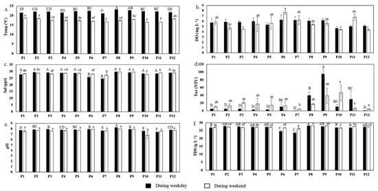 Bar charts showing the (a) average temperature (Temp), (b) dissolved oxygen (DO), (c) salinity (Sal), (d) turbidity (Tur), (e) pH, and (f) total dissolved solid (TDS) of the water samples collected from Tai O during a weekday and weekend (n = 3, mean ± SD) across the 12 sampling points. Different uppercase letters denote statistically significant differences among the weekday sampling points, while the lowercase letters indicate significant differences among the weekend sampling points (Tukey, p < 0.05). An absence of any letters signifies no difference among the sampling points.