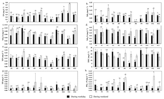 Bar charts showing the (a) average total nitrogen (TN), (b) ammonia (NH3), (c) nitrate (NO3-N), (d) nitrite (NO2-N), (e) total inorganic nitrogen (TIN), (f) total organic carbon (TOC), (g) total phosphorus (TP), and (h) orthophosphate (PO4-P) content in water samples collected from Tai O during a weekday and a weekend (n = 3, mean ± SD) across the 12 sampling points. Different uppercase letters denote statistically significant differences among the weekday sampling points, while lowercase letters indicate significant differences among the weekend sampling points (Tukey, p < 0.05). An absence of any letters signifies no differences among the sampling points.