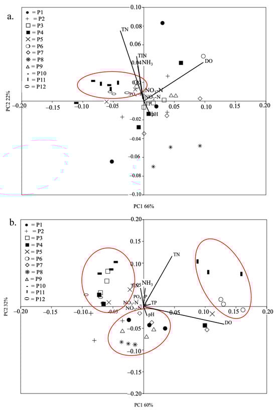 PCA biplots ((a): during the weekday and (b): during the weekend) are used to indicate the relationship between various water parameters (TN, TIN, NH3, NO3-N, NO2-N, TP, PO4-P, DO, pH) across the sampling points (symbols). Red circles represent correlation of variables a with the first two principal components.