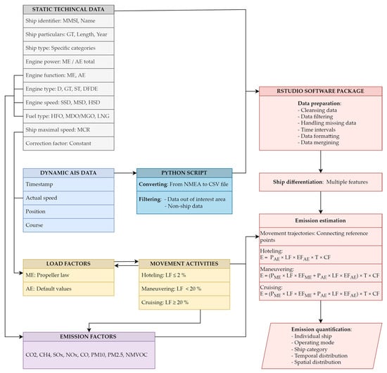 In the last step of the preprocessing phase, the RStudio software package was used to develop code that enabled the cleansing, filtering, formatting, and merging of data. Cleansing was applied on AIS datasets, aiming to exclude duplicate and faulty data. In this process, entries missing identifiers and/or all particulars were screened out. Ships that passed through the interest area but did not arrive at the designated port basin were filtered out. The same principle was applied to the entries or the entire movement tracks with abnormal values for speed (more than 40 kt), position, and/or time. After eliminating inadmissible datasets, 49,540,895 entries were used for the research. Given that the technical and activity datasets were collected from several sources, their structure had to be formatted to establish a standardised form. Once a consistent display of the cleansed and filtered data was achieved, the specific technical details of each vessel were merged with all corresponding activity entries recorded in 2019 by linking the unique identifiers. Performing all the mentioned steps of the preprocessing phase within the model enabled emission estimation on a ship-by-ship basis, but also the implementation of the specific differentiation of ship types.