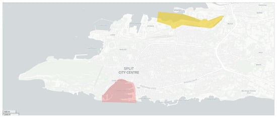 Part of the area of the North port is marked in yellow, while the City port basin is in red. The grey area in between represents the urbanised parts and the locational connection of the City port with the town centre. Note: the map was generated with the RStudio software package and then modified.