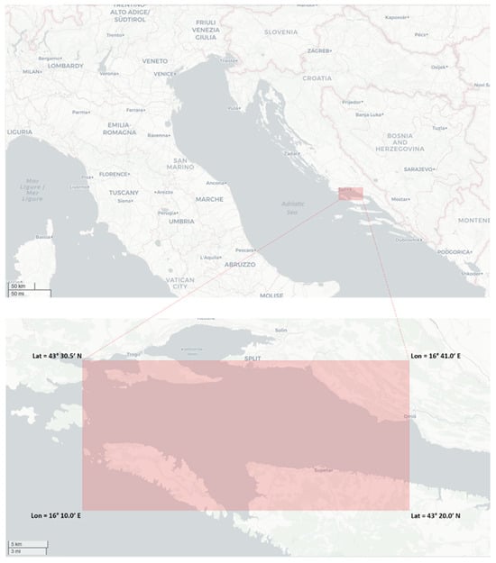 Spatially, the Port of Split is divided by the city of Split into two dislocated areas. One area, called North port, is situated on the northern side of the Split peninsula and consists of several basins, mainly for cargo ships. City port basin forms the second part of the port, which is intended for passenger ships and where, on average, about 90% of all maritime traffic is handled. The City port is located in the southern part of the Split peninsula, where it is spatially and infrastructurally integrated into the city centre, what can be seen in Figure 2. Due to the locational connection with the urban environment, high traffic density of City port and the fact that Split is the second most populated Croatian city, air degradation can represent a serious threat to public health. The city’s connection with the Adriatic islands and the Apennine Peninsula via numerous shipping lines and its popularity as a cruise and tourist destination with a growth trend further emphasises the need for monitoring and control of pollutants from maritime traffic. Thus, this study focuses on the area of the City port with the aim of estimating and analysing ship-induced air pollution. The research area with the relevant coordinates is shown in Figure 3. The dynamic AIS data was transferred through Python, while the handling and analysis were carried out using the RStudio software package (https://www.r-studio.com/data-recovery-software/).