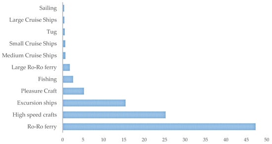 According to the processed data from AIS, the number of ships calling at the Port of Split—City port basin in 2019 was 16,429. This number corroborated the port traffic statistics, since the movement trajectories, such as datasets that represent port visits, form the basis for calculating emissions. The quantity of calls identified was found to match maritime transportation data with 100%, 98%, 95%, 96%, and 94% for all types of cruise ships, both types of Ro-Ro ferries, high-speed craft, tugs, and fishing ships, respectively. However, the arrival figures for excursion ships, pleasure craft and sailing ships were reported differently in the various sources of shipping statistics data and could not be compared as the other ship types. There is, therefore, a possibility that the emissions released by the mentioned ship types are greater than estimated in this research. The explanations for the discrepancies mentioned are explained in the section Uncertainties, while the distribution of port calls per ship type determined from the AIS database used in this research is shown in Figure 4.