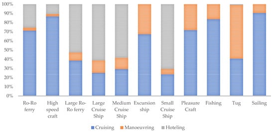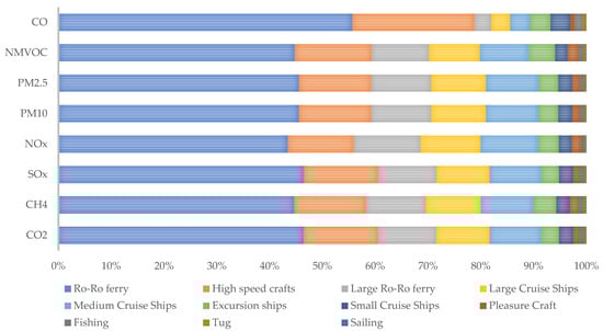 A general overview of the emissions produced in the different operating modes indicates that 59%, 8%, and 33% were released in cruising, manoeuvring, and hoteling activity, respectively. However, this fact varies considerably with the different types of ships, which is shown in Figure 6. On an annual basis, Ro-Ro ferries, high-speed craft, excursion ships, pleasure craft, and sailing ships emitted most of the pollutants during cruising activity. On the other hand, all types of cruise ships and large Ro-Ro ferries produced larger volumes of emissions during the hoteling phase, while for tugs, the manoeuvring mode was dominant.