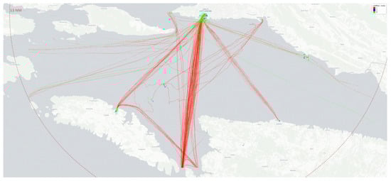 The primary function of AIS is to ensure higher level of navigational safety by sharing timely information on ship characteristics and their movement between other vessels and the shore []. However, both static and dynamic data transmitted by AIS provide a detailed overview of ship movements and their characteristics, which is more often applied in emission estimation process [,]. Therefore, the AIS database that contains relevant shipping data applied in this research was provided by the Faculty of Maritime Studies in Split. Generally, the static data broadcasted through AIS refers to MMIS number, IMO number, ship type, length, name, and call sign [,]. Dynamic data on ship movement reveals the position of the ship, the timestamp, the course over ground (COG), and the speed over ground (SOG) [,]. As the AIS dataset does not contain all features required for the estimation of emissions, such as engine details or LF, only dynamic data was used, while static information represented by the above identifiers was included in the data merging process.