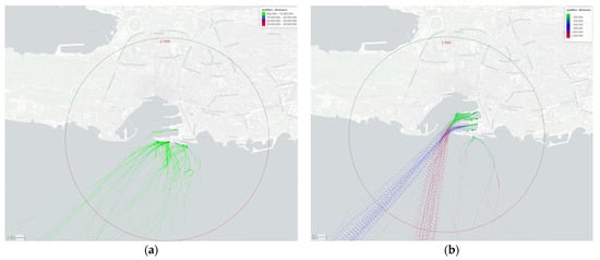 Activity-based ship spatial distribution map of emission sums (in g) per port call for a period of one month (October) with radius of 1 NM from the point where the largest levels of emissions are released: (a) large cruise ships, (b) Ro-Ro ferries.