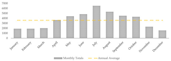The increased demand for shipping services is strongly connected to the tourist season, as this industry is a major source of income for the local economy. Therefore, a higher volume of emissions was generated during the summer months, which correlates with seasonal traffic intensity. Since the different types of passenger vessels are predominant in the transportation mix, both GHG and APS production show almost the same trend, so their temporal distribution over the twelve-month period with annual average for 2019 is shown in Figure 9. It can be observed that there is a particular difference between months in which the average emissions were significantly exceeded and those in which they were approximately the same or lower. In this case, the months in which the recorded values are above average individually had emissions more than twice as high as months from the rest of the year. This difference is particularly significant for July, when emissions are generally three times higher than those estimated for January, February, March, November, or December, and almost double the annual average of 3605 t.