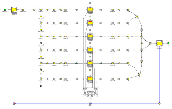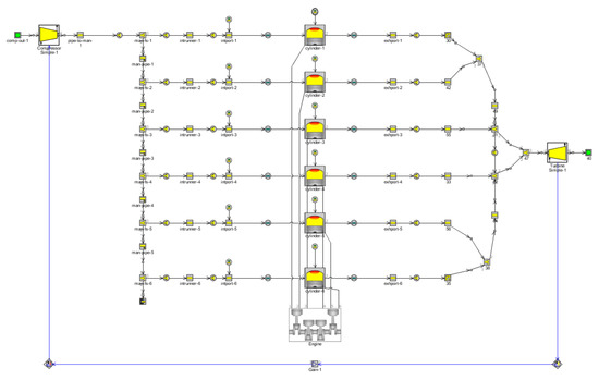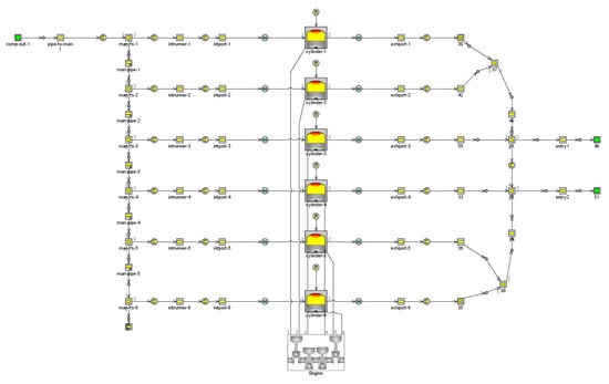 The experimental data of the engine are from Li et al. [33]. The engine prototype is a six-cylinder, in-line, four-stroke diesel engine. Its main parameters are shown in Table 2 [33]. The working environment settings are 1 ATM and 300 K, and the fuels are diesel and methanol, both of which are injected directly into the cylinder by the nozzle. The ignition sequence of the engine is 1-5-3-6-2-4, the combustion model is EngCyl Comb DI Wiebe, and the heat transfer model is Woschni GT. The model is shown in Figure 1.