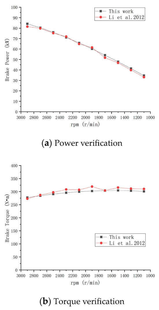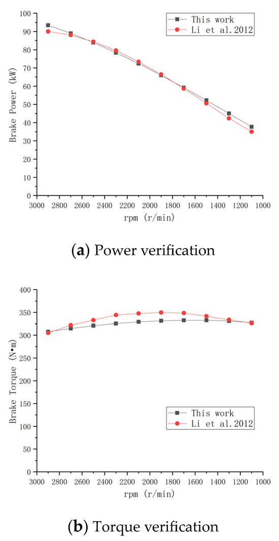 To verify the accuracy of the simulation model with reference to experimental data, different fuel injection amounts are set for 10 groups of speed conditions from 1100 rpm to 2900 rpm (Table 3). The model is verified by the output power and the torque change curve. As can be seen from Figure 2 and Figure 3, the simulation of braking power and braking torque of pure diesel and M15 fuel (methanol mass fraction is 15%) is basically consistent with the actual value and trend [33], and the errors in most data are less than 5%. Therefore, it can be considered that this model can be used.