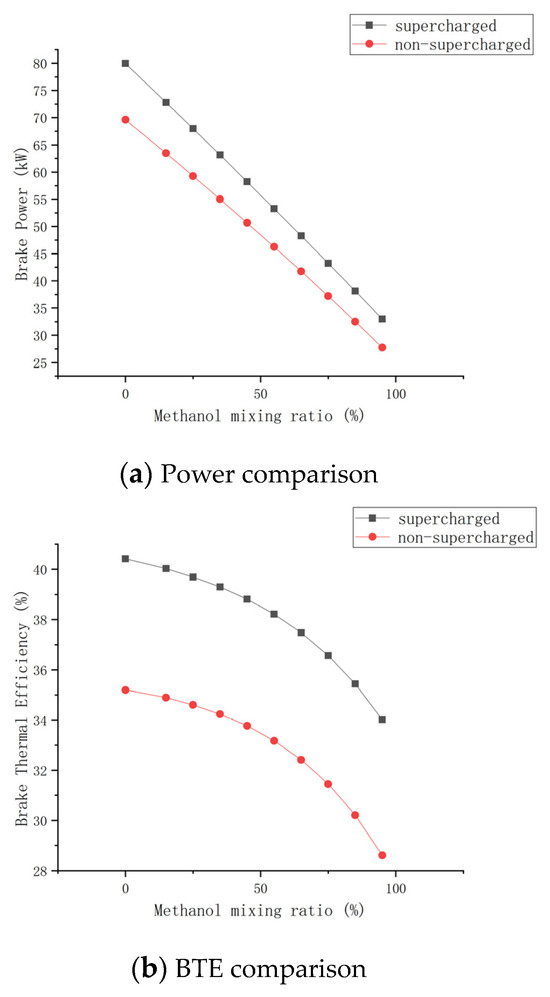 Figure 5 shows the changes in power and BTE of diesel–methanol blends with different methanol blends when the engine is turbocharged, or not, at 2000 rpm. Both power and BTE increased by approximately 15%, and by 19% with the highest methanol blends.