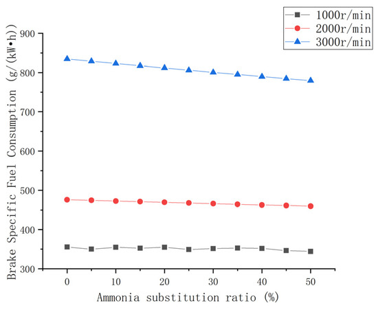 The change in engine BSFC as a function of the ammonia blend ratio for three speed conditions is shown in Figure 10. When burning the same fuel, the BSFC at high speed is obviously higher than that at medium and low speeds. The average value is more than 200% higher than that at low speeds and about 170% higher than that at medium speeds. The BSFC of the three speed conditions decreases with the increase in the ammonia blending ratio, and the decrease increases with the increase in the speed. Compared with the N0 fuel, the BSFC of low, medium, and high speed conditions decreases by 3.1%, 3.5%, and 6.6%, respectively. The BSFC of high speed conditions decreases by about twice as much as that of low and medium speed conditions.