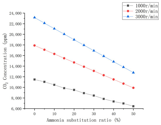 The variations in the engine’s CO2 emissions as a function of the ammonia blend ratio at three speed conditions are shown in Figure 12. When burning the same fuel, the relative CO2 emissions of the three speeds are high speed > medium speed > low speed, and the total decreases with the increase in ammonia content. Compared with the N0 fuel, the CO2 emissions of low, medium, and high speed conditions decrease by 44%, 45%, and 45%, respectively, when burning the N50, which is basically the same. Wang et al. [34] simulated the effect of premixed natural gas–ammonia and diesel ignition on engine combustion. The results showed that the emission of CO2 decreased significantly with an increase in ammonia content. Other studies also show similar conclusions [35,36].