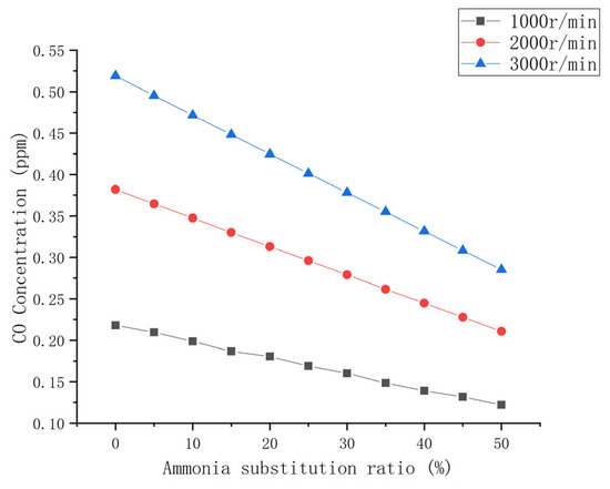 The variations in the engine CO emission ratios with an ammonia mixture ratio under three speed conditions are shown in Figure 13. It can be seen that, as the ammonia content increases, the relative magnitude of CO emissions under the three speeds is high speed > medium speed > low speed. Compared with the N0 fuel, the CO emissions in the low, medium, and high speed conditions of the N50 decrease by 44%, 45%, and 45%, respectively. This is basically consistent with the change in CO2 emissions. The sharp decreases in CO2 and CO emissions are related to the decrease in the carbon content of the fuel, which decreases by about 3.3% for every 10% increase in ammonia content. Similar conclusions can be found in the study of the performance of diesel-ignited ammonia–hydrogen blends in engines by Wang et al. [37].