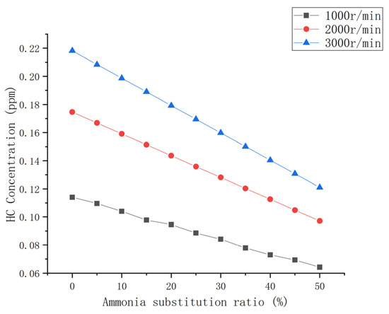 The variations in the HC emission ratios of the ammonia-blended engine under three speed conditions are shown in Figure 14. Compared with the N0 fuel, the HC proportions decrease by 44%, 55%, and 55% under low, medium, and high speed conditions, respectively. The overall change trend and range of the HC emission percentage is basically the same as those of CO2 and CO emissions. The decrease in the proportion of HC emissions indicates a decrease in the proportion of unburned and incompletely burned fuels. As confirmed by the change in effective fuel consumption, its essence is an improvement in combustion. Previous studies have mixed ammonia with fuels such as gasoline and methane and tested it in a single-cylinder engine with a maximum replacement rate of 50%. The results by Vinod et al. [38] show that the addition of ammonia improves the combustion stability of gasoline and methane, and HC emissions can be increased.