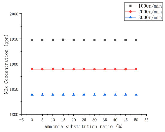 The variations in the NOx emission ratios of the engine with an ammonia mixture ratio under three speed conditions are shown in Figure 15. With an increase in the ammonia blending ratio, the emission at each speed is basically unchanged, and the rate of increase or decrease is about 0.01%. In this study, ammonia and methanol were premixed with air, injected into the intake pipe, and then mixed with diesel fuel in the cylinder. The charging efficiency and the air temperature are improved by turbocharging, which is beneficial to the full combustion of ammonia and methanol. The N2O in the tail gas thermally decomposes into NO, which reduces greenhouse gas emissions. However, with an increase in the ammonia blending ratio, the emission proportion of unburned ammonia also increases. In particular, the addition of turbocharged modules exacerbates this trend, which can also explain why the nitrogen in the fuel increases while NOx emissions remain basically unchanged. With the increase in the ammonia ratio, the emission densities of CO and CO2 in the engine exhaust decrease by about 50%. The HC emissions decrease significantly, and the total amount of NOx remains basically unchanged. This indicates that the use of ammonia–methanol blends is expected to improve the greenhouse effect emissions from the engine. Wang et al. [35] studied the effects of using the best mixing method and mixing ratio of ammonia–diesel fuel on the combustion and the emission performance of an engine. The results from Wang et al. [35] also show that the emissions of NOx can be reduced using ammonia–diesel fuel in engines.
