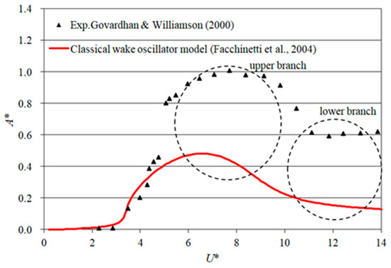 To demonstrate the defect of the classical wake oscillator model more intuitively, the cylinder with low mass-damping ratio (m* = 1.2, m*ζ = 0.006) is taken as an example. The response of maximum amplitude (A* = Amax/D) of the cylinder versus reduced velocity (U* = 2πU/(ωs D)) is calculated by the classical wake oscillator model and compared to the experimental data [14]. The results are plotted in Figure 2.