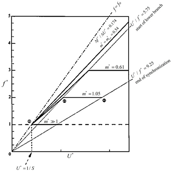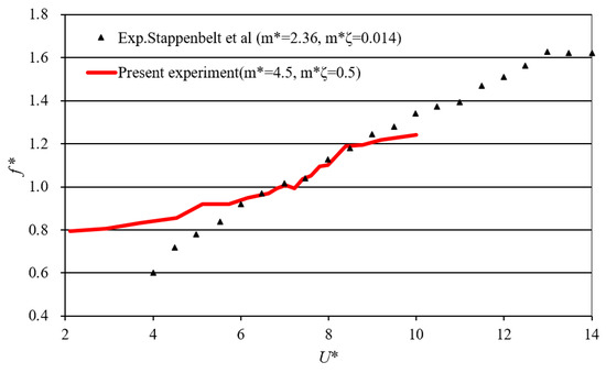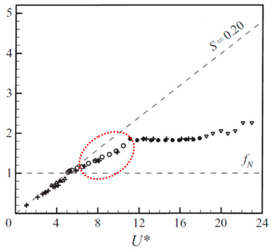 The frequency response in the upper branch is more complex. As shown in Figure 3, the upper branch starts form about U* = 5. When the mass ratio m* is less than the critical value 0.54, the lower branch will disappear, f* increases linearly with the increase of U*, and the slope is about 0.174 [14]. Therefore, the following relation can be obtained.