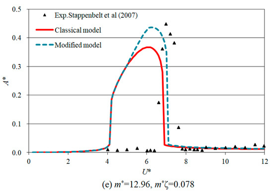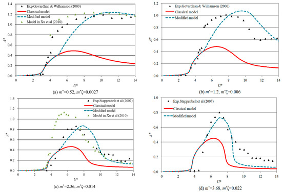 Figure 5 shows the calculation results of the maximum amplitude versus reduced velocity by modified wake oscillator model for four different values of m*ζ and the corresponding results calculated by the classical model. The calculated results are compared with the experimental data [14]. The range of m* is 0.52~12.96, and the range of m*ζ is 0.0027~0.078. In Figure 5a,c, we also plot the results of the modified wake oscillator model proposed in the reference [21] as a comparison.