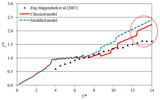 As shown in Figure 6, in terms of vibration frequency, both the modified and classical models exhibit the same trend. As van der Pol oscillator Equation (6) has a significant impact on the frequency characteristics of calculation results, we changed only the reference lift coefficient CL0 in the modified model, which will not alter Equation (6)’s characteristics. Generally, the calculation results for the upper and initial branches are consistent with the experimental results. However, the calculation results for the lower branch are quite different from the experimental results. Especially for U* > 12, the experimental results show a constant vibration frequency, whereas calculation results show a linear increase of vibration frequency.