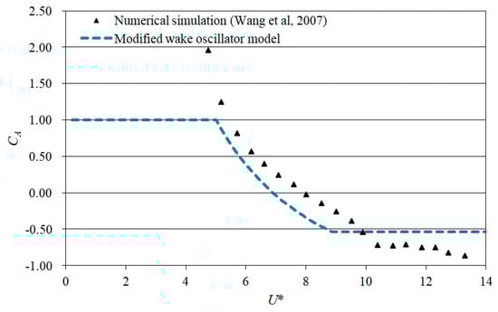 As shown in Figure 7, in upper and lower branches (U* > 5), the calculation results of parameter CA in the modified wake oscillator model are in good agreement with the numerical simulation results in the literature, proving the correctness of the related algorithms in the modified model. In the regime of initial branch (U* < 5), the value of CA is 1, which is corresponded to the classical model. This is in accordance with the expectation since the modification of the improved model only focuses on lock-in regimes.