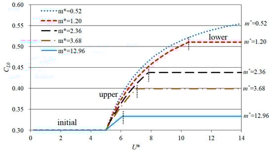 Variation of CL0 in the modified wake oscillator model versus reduced velocity with different m*.