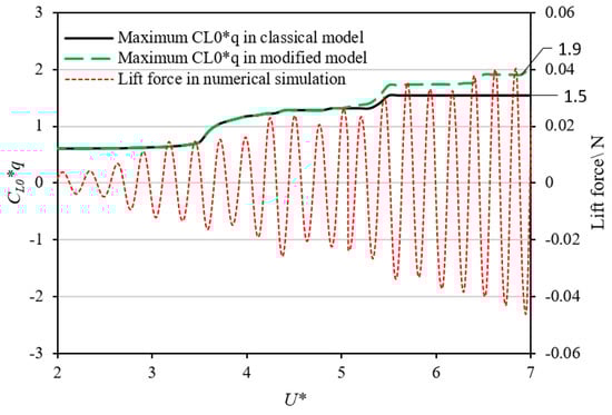 Since the improvement in this paper is primarily directed at the lift coefficient, the rationality of the above improved method will be verified by analyzing the lift coefficient. Take the test condition of m* = 2.36, m*ζ = 0.014 as an example, the value of parameter CL0*q (the parameter characterizing the lift force) is compared with numerical simulation results at different flow velocities (See Figure 9). An in-depth description of the numerical simulation method can be found in the author’s previous work [35].