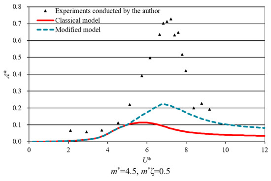 As shown in Figure 10, despite the modified model’s calculated A* being closer to the experimental value than the classical model, the calculation error is substantial. In particular, the maximum amplitude calculation error is approximately 68%, which is insufficient to meet engineering forecasting requirements. These results indicate that the modified wake oscillator model at present form is not suitable for cases with high damping ratios (although the mass ratio is low).