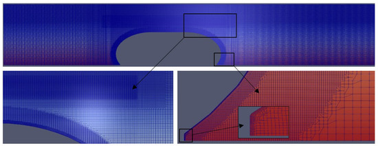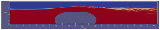 For the validation of the BELWF, we apply the widely used open-source software OpenFOAM [35]. OpenFOAM applies the VOF method [36]. Figure 2 presents the grid, generated out of 207,777 cells, modeling a short wave-flume of length 45 m and height 7 m. This mesh demonstrates an important benefit of the BEM, which reduces the spatial dimension of the model by one. Whereas the VOF method for two-dimensional problems requires the mesh of the solution area into a grid of area elements, the BEM integral equation requires only the mesh of the boundary contour of the solution area into one-dimensional line elements. This is considerably simpler and computationally efficient. Modeling the same geometry in BELWF requires fewer than 1000 boundary elements. However, the VOF method is made to track the foamy free surface for breaking waves, as Figure 3 demonstrates.