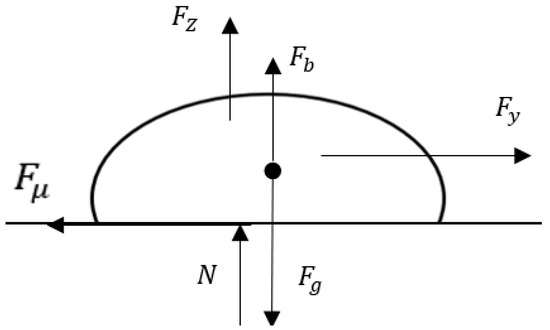 The Geotube lays on natural ground, and it cannot be assured that the water pressure will not act on the bottom of the structure. Hence, it is safer to assume that the dynamic pressure penetrates between the seabed and the bottom of the structure, and in the critical situation contributes to the uplifting of the Geotube. To consider this uplift load, we subtract from Equation (3) also the approximated force acting on the contact region of the Geotube with the seabed ():